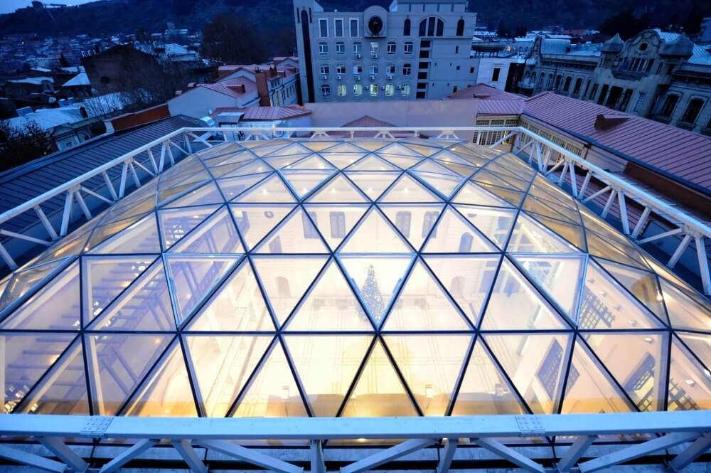Projekt tárgya: A régi városháza felújítása. A meglévő tégla épület közel négyzetes központi terének lefedése egy egyhéjú acél dongatetővel. Acélszerkezet üveg borítással.