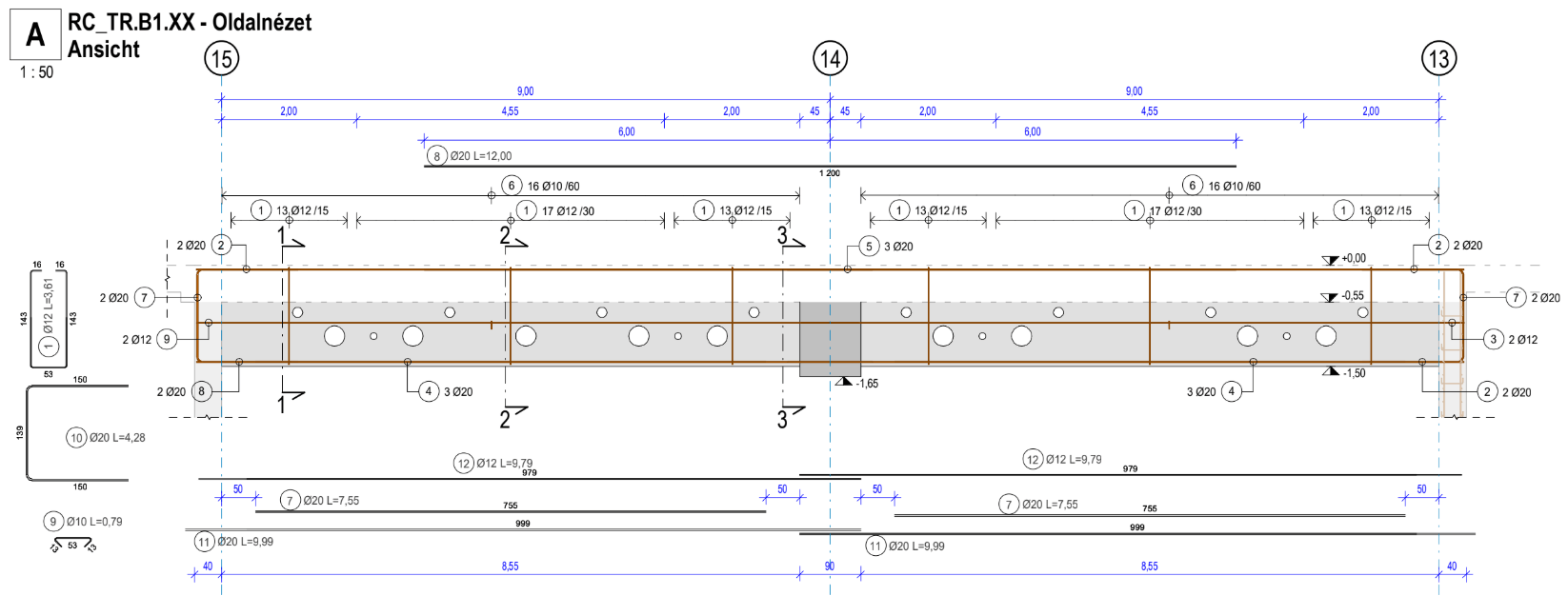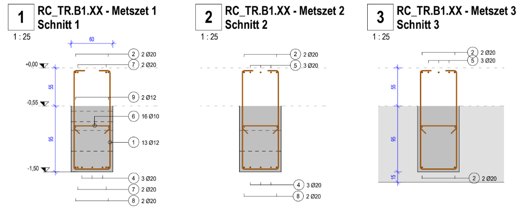 A betonszerkezetek vasalását nagyrészt 3d eszközökkel, azonos platformon (Reviten) belül kezeltük a zsaluzási geometriával, melynek nagy előnye, hogy minden információ egy helyen van, nincs verzióhiba vagy szoftverek közötti adatvesztés. A betonozás ütemezésének információit a beton objektumokhoz hozzárendelve a terveken konzisztens munkahézag pozíciók jelentek meg, melyek nagyban könnyítették a vasalás kivitelezhetőségének feltételeit.