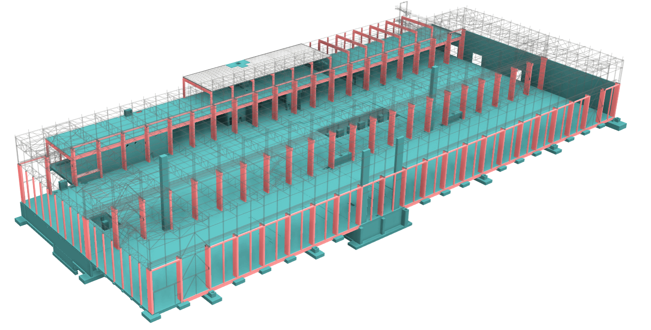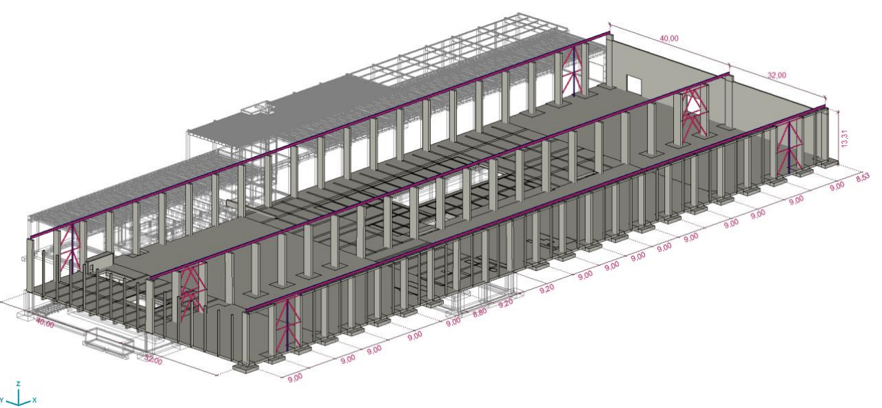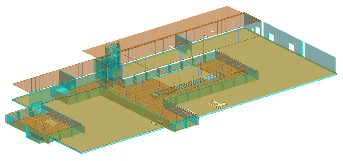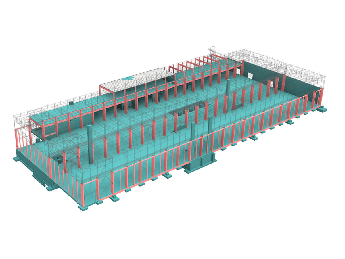 A tartószerkezet statikai vizsgálatához használt erőtani számítási modell elemeit (AxisVM és IDEA Statica) a BIM modellező szoftverben (Revit) leképezett statikai váz felhasználásával, automatizálva készítettük, mely a gyors munka mellett a hibalehetőséget is csökkentette. A megrendelő számára rendszeresen megküldött BIM modellen végrehajtott ütközésvizsgálat eredményeivel folyamatosan pontosítottuk a modellt, a geometriai hibákat elkerülendő.