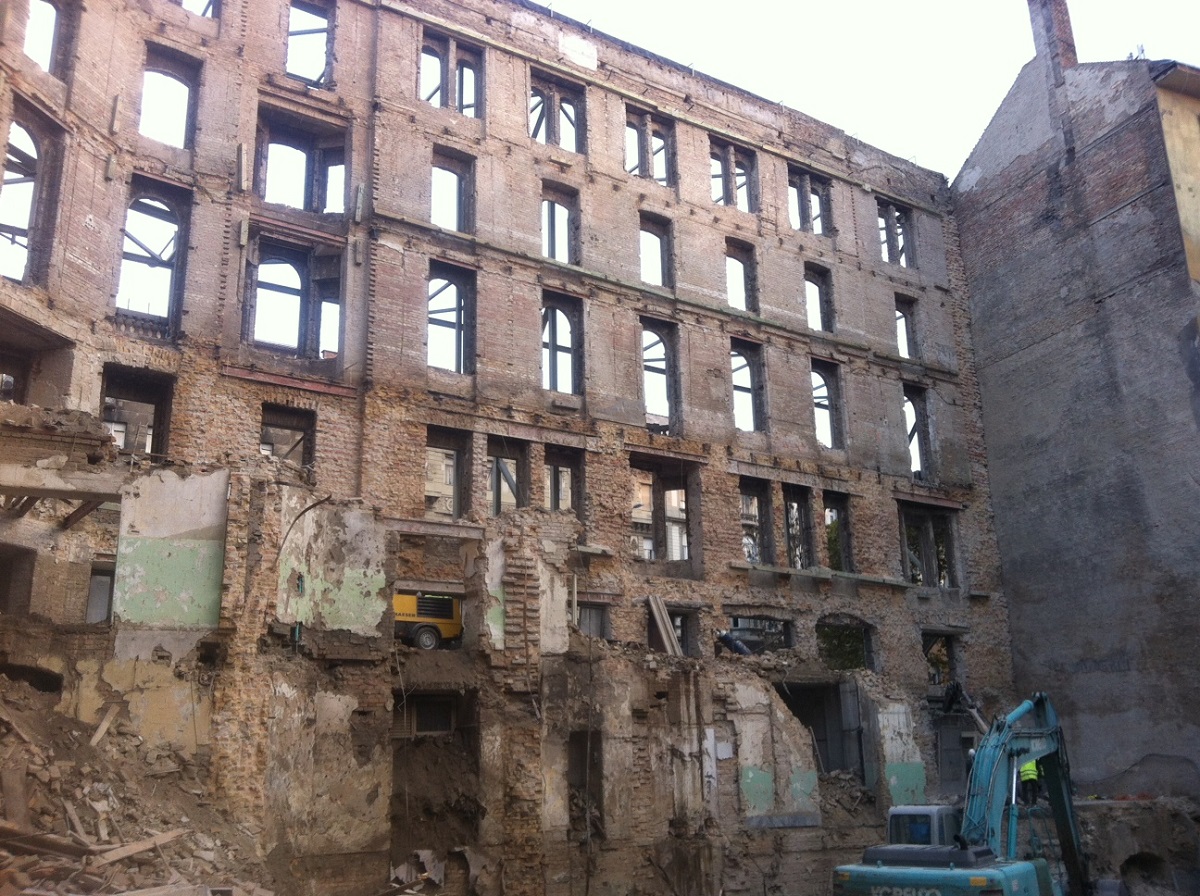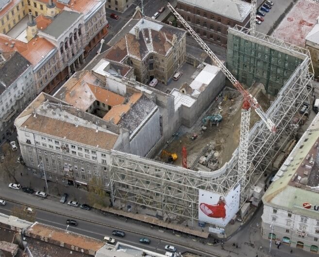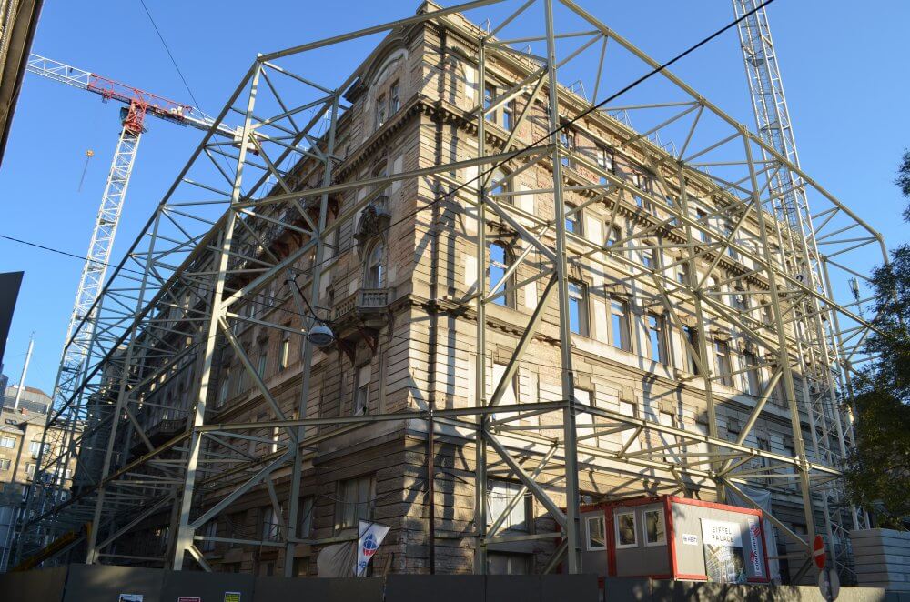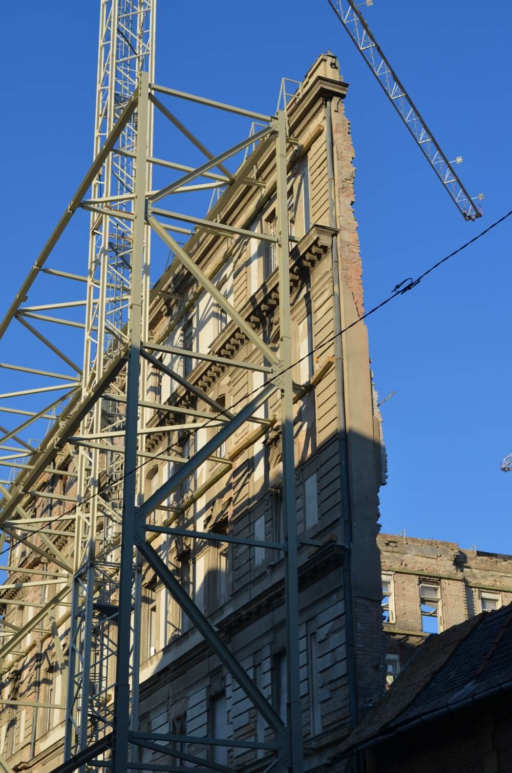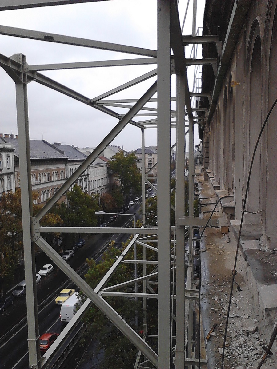Projekt tárgya: A projekt során az épületbontás során megtartandó homlokzat ideiglenes megtámasztásának acélszerkezeti tervezése volt a feladatunk. Tartószerkezeti tervezés, gyártmánytervezés.